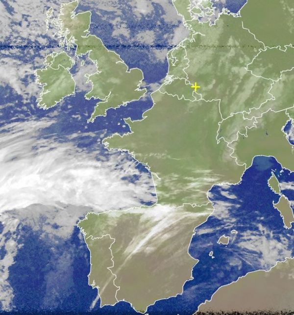Das Satellitenbild von heute Morgen zeigt über der Biskaya die verbreitet kompakten Wolken eines Tiefs, besonders in den Küstenregionen Nordspaniens und an der Westküste Frankreichs bildeten sich gebietsweise, teils kräftige Schauer.