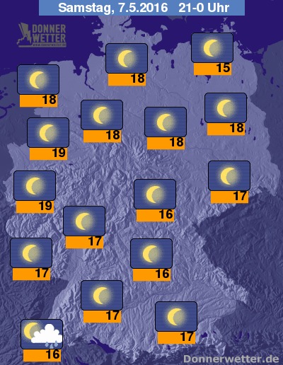 Heute Abend zeigt sich der Himmel über der Bundesrepublik fast überall sternenklar, nur am Schwarzwald und am Bodensee sind vereinzelt dichte Quellwolken und örtliche Schauer und Gewitter möglich, sonst bleibt es hingegen trocken. Die Abendwerte liegen bei sehr milden 19 Grad im Rheinland und ebenfalls milden 16 Grad in Mittelfranken.