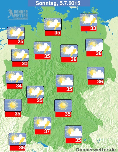 Heute ist es besonders vom Osten bis in den Süden verbreitet heiter bis sonnig und bis zum Abend weitgehend trocken. Weiter nach Westen und Norden hin ist es gebietsweise heiter, zunehmend ziehen aber auch kompakte Quellwolken auf, die zu regional unwetterartigen Gewittern führen. Gegen Abend sind auch im Osten und im Südwesten teils schwere Gewitter möglich. Die Höchstwerte liegen bei schwülwarmen 25 Grad an der Nordsee und sehr drückenden 37 Grad in Stuttgart.