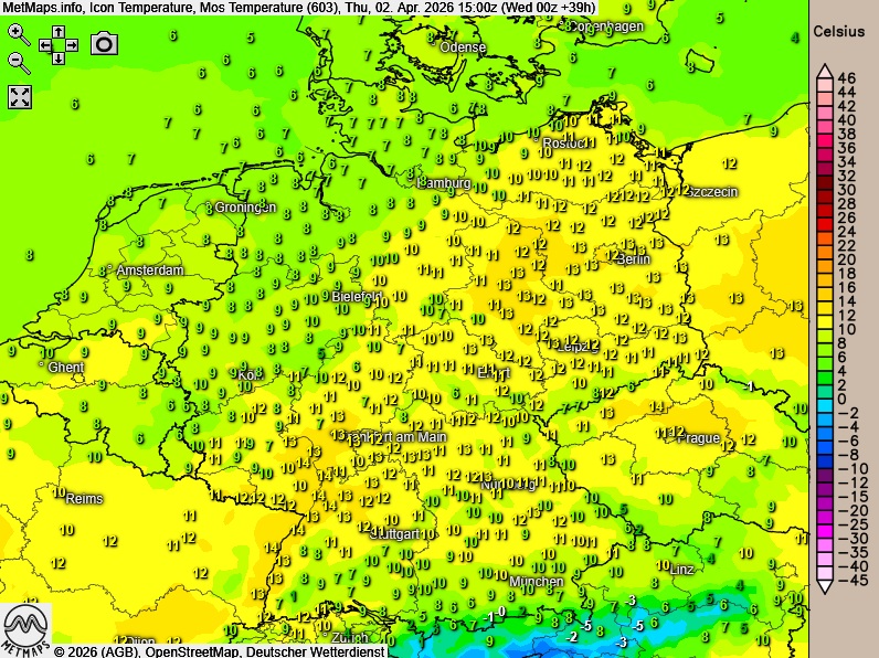 Die Wetterkarte (06:00 Uhr), Temperaturanomalie (12:00 Uhr) sowie Temperaturen um 15:00 Uhr nach ICON: