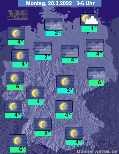 In der Nacht zum Montag zeigt sich der Himmel über dem Land verbreitet sternenklar. In Vorpommern bleiben bis zum Morgen hin noch oft lockere Wolken erhalten, dazu bleibt es trocken. Die Temperatur sinkt auf 6 Grad in Dresden und bis 2 Grad in Hamburg.