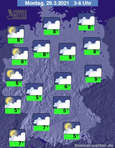 In der Nacht zum Montag bleibt die Wolkendecke überwiegend verschlossen, im Laufe der zweiten Nachthälfte lockert es im Süden und Westen jedoch vielerorts auch auf. Es bleibt landesweit trocken bei 9 Grad in Münster und bis 5 Grad in München.