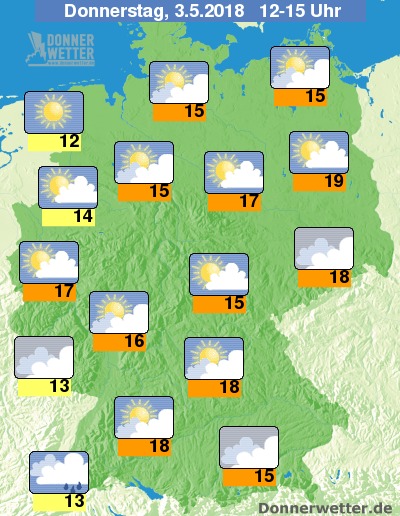 Im Lauf des Nachmittags löst sich die Bewölkung in weiten Landesteilen fast vollständig auf und der Abend wird überaus sonnig. Nur im Schwarzwald und am Alpenrand verdecken nach wie vor dichte Wolken die Sonne und es regnet zeitweise.