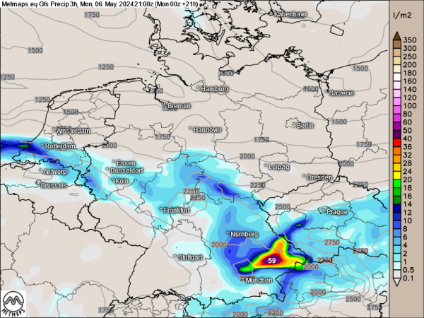 Die Karte zeigt die 3-Stunden-Regenmengen bis 21:00 Uhr heute Abend (GFS-Modell). Vor allem im Großraum München / Oberbayern fallen große Regenmengen binnen kurzer Zeit.