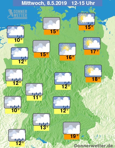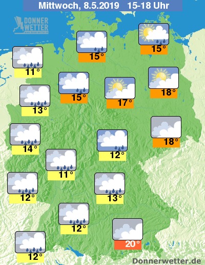 Die Temperaturen liegen im Regen nur bei 10 bis 14 Grad. Dort wo es noch längere Zeit trocken bleibt werden 15 bis 20 Grad erreicht. Die höchsten Werte findet man dabei wahrscheinlich am föhnigen Alpenrand.
