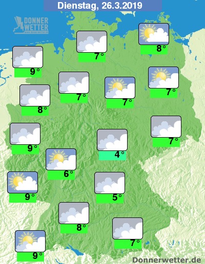 Am Dienstag ist es überwiegend stark bewölkt, nur selten zeigen sich Auflockerungen. Gebietsweise fallen ein paar Tropfen, sonst bleibt es trocken. Die Temperatur steigt auf 4 bis 9 Grad.