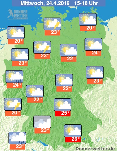 Bis zum Abend breiten sich teils kräftige Regengüsse und Gewitter über die Westhälfte aus und erreichen im weiteren Verlauf auch die mittleren und nördlichen Landesteile. Im Osten und Süden bleibt es jedoch meistens freundlich und trocken.