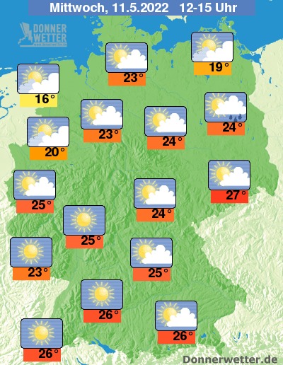 Heute Nachmittag ist es über dem Norden teils locker, teils stark bewölkt, dazu sind nur selten Schauer möglich. Im Rest der Republik ist es verbreitet heiter oder sonnig, dabei bleibt es weitgehend trocken. Die Temperatur liegt bei eher kühlen 16 Grad an der Nordsee und bis 27 Grad in der Lausitz, An der Nordsee weht ein oft stürmischer Wind.