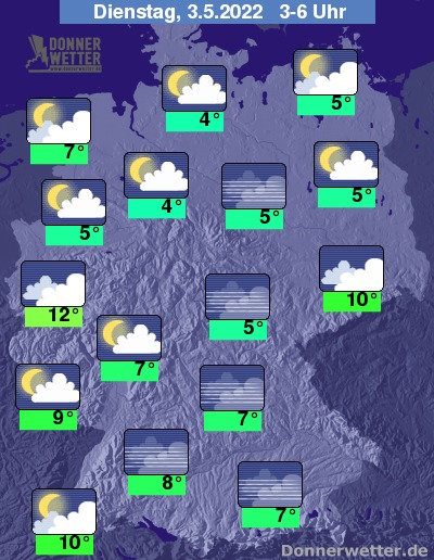 In der Nacht zum Dienstag lockert und klart es auch im Süden überwiegend auf, hier und da hält sich auch stärkere Bewölkung, jedoch bleibt es trocken. Die Temperatur sinkt auf 12 Grad in Köln und bis 4 Grad in Hamburg.