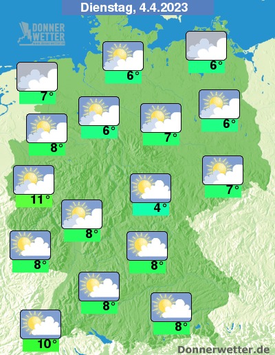 Am Dienstag zeigen sich gebietsweise heitere Abschnitte, oft ist es aber auch wechselnd bis stark bewölkt, dabei bleibt es trocken. Die Temperatur steigt auf 4 Grad im Vogtland und bis 11 Grad im Rheinland.
