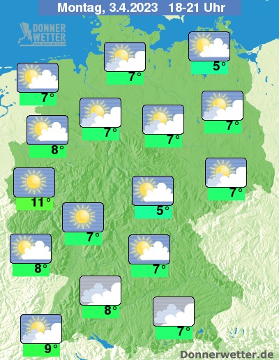 Heute Abend halten sich besonders im Alpenvorland noch oft dichte Wolken, auch in den östlichen Landesteilen ziehen gebietsweise einige Wolken durch. Im übrigen Bundesgebiet ist es jedoch verbreitet heiter bis sonnig. Es bleibt überall trocken bei Werten von 5 Grad an der Ostsee und bis 11 Grad im Rheinland.