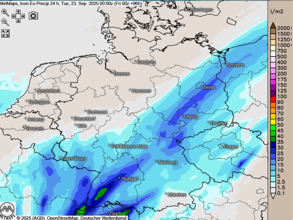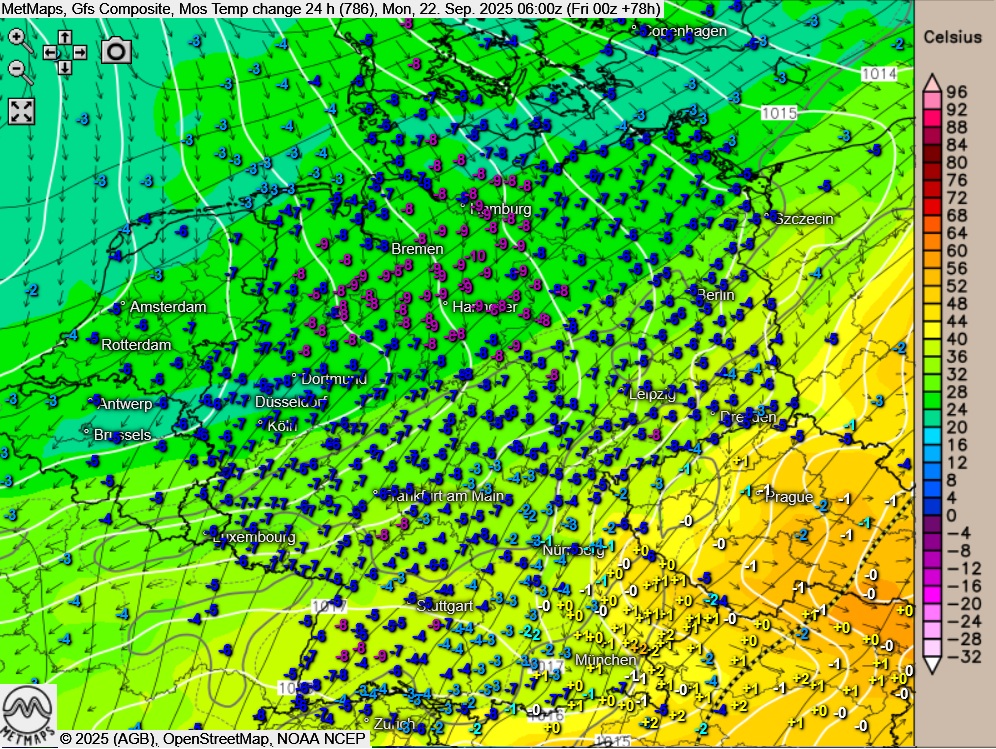 Die Strömungskarte mit dem 24-Stunden-Temperaturabfall für Montagmorgen nach GFS (06:00 Uhr) und die 24-Stunden-Regenmengen für Montag nach Icon-Eu:
