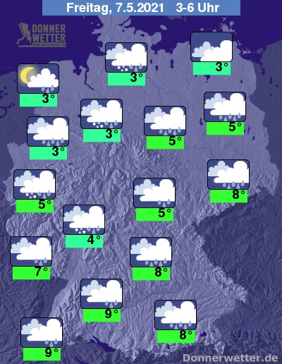 In der Nacht zum Freitag ziehen verbreitet dichte Wolken durch und es fällt immer wieder Regen, zum Teil ist sogar Schneeregen oder Schnee bis in die Niederungen möglich. Die Temperatur sinkt auf 9 Grad in Stuttgart und bis 3 Grad im Norddeutschen Tiefland.