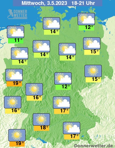 In der Nacht zum Donnerstag zeigt sich der Himmel im Süden oft sternenklar, sonst ist es meist gering oder wechselnd, im Nordwesten im Verlauf auch teils stark bewölkt. Es bleibt trocken bei Tiefstwerten von 9 Grad in Freiburg und etwa 3 Grad in Jena.