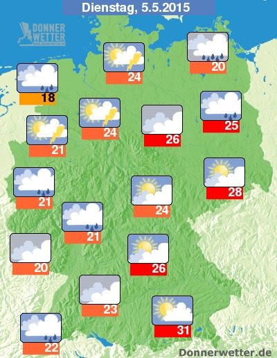Am Dienstag Vormittag ist es im Süden und Osten noch oft locker oder aufgelockert bewölkt und trocken, sonst ziehen aber schon teils dichte Quellwolken auf und es können sich kräftige Schauer und mögliche Gewitter entwickeln. Ab den Nachmittagsstunden schauert und gewittert es auch im Süden und Osten zum Teil kräftig. Es werden 18 Grad an der See, sonst 20 bis 28, im Süden bis zu heißen 31 Grad erreicht.