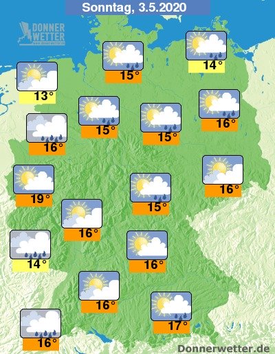 Am Sonntag zieht den Tag über wechselnde oder starke Bewölkung durch, über der Nordhälfte bilden sich dabei einzelne Schauer, im übrigen Bundesgebiet ist es bis auf vereinzelte Ausnahmen dagegen meist trocken. Die Temperatur steigt auf 13 Grad an der Nordsee und bis 19 Grad in der Kölner Bucht.