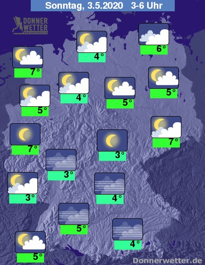 In der Nacht zum Sonntag lockert und klart der Himmel über der Bundesrepublik verbreitet auf, lediglich am Alpenrand und vereinzelt im Osten sind anfangs noch vereinzelt Schauer möglich, sonst bleibt es trocken. Die Temperatur sinkt auf 7 Grad in Aurich und bis 3 Grad im Eichsfeld.