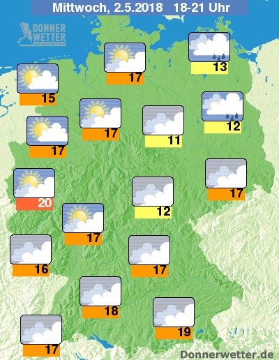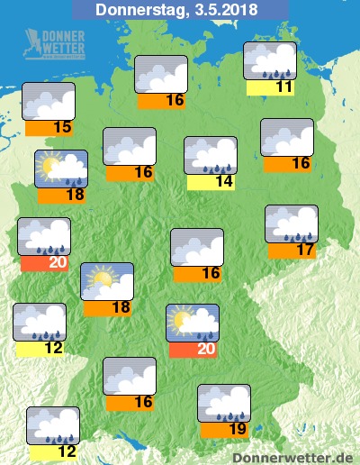 Am Donnerstag ist es den Tag über häufig stark, hin und wieder auch aufgelockert bewölkt, dabei fällt vor allem über den westlichen Landesteilen zeitweise Regen, im Süden bilden sich gebietsweise Schauer, jedoch sind auch in den übrigen Landesteilen gebietsweise Regenfälle möglich. Die Temperatur erreicht nur 11 Grad in Stralsund und bis 20 Grad in Nürnberg.