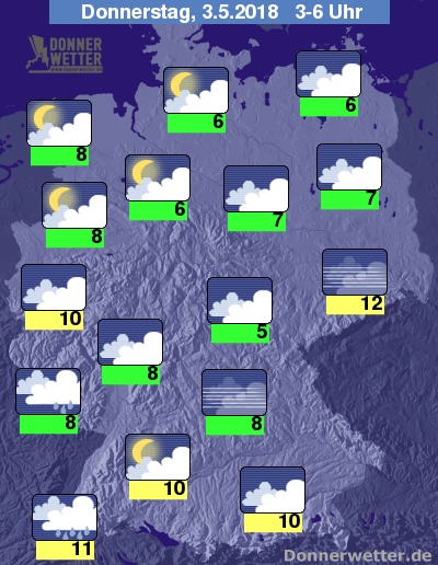 In der Nacht zum Donnerstag ist es zunächst größtenteils stark, teils aufgelockert bewölkt und trocken. Vor allem über dem Nordosten, jedoch auch über Sachsen ist zunächst noch Regen möglich. Zum Morgen hin zieht im Südwesten Regen auf. Die Temperatur sinkt auf 11 Grad im Breisgau und etwa 5 Grad im Eichsfeld.