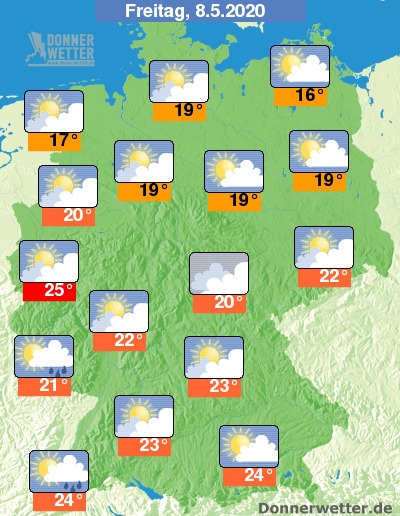 Die Höchsttemperaturen bewegen sich im Norden und Osten zwischen 16 und 22 Grad, am kühlsten bleibt es dabei im Küstenbereich von Nord- und Ostsee. Im Süden und Westen werden frühsommerliche 22 bis 26 Grad erreicht.