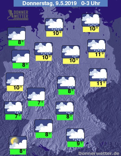 In der Nacht zeigt sich der Himmel zunächst noch dicht bewölkt oder bedeckt und vor allem in der Nord- und Osthälfte fällt immer wieder Regen, der teils auch kräftig ausfallen kann. In der Westhälfte bleibt es meist trocken.