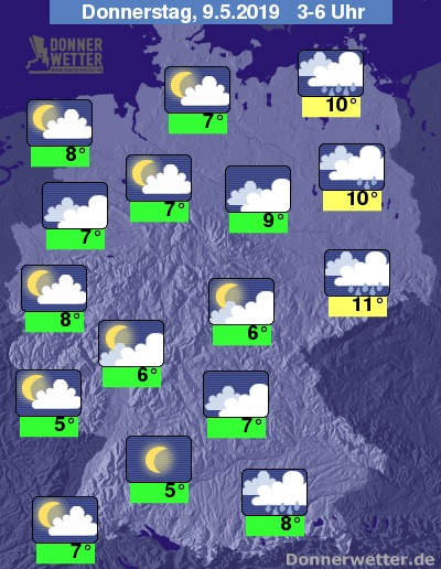 Im weiteren Nachtverlauf lockern die Wolken über weiten Landesteilen auf, eine geschlossene Wolkendecke, aus der immer wieder Regen fällt, hält sich in der ersten Nachthälfte vor allem entlang Oder. In den übrigen Teilen der Republik bleibt es meist trocken.