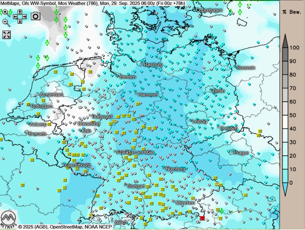 Die Strömungs- und Temperatur- sowie die Wetterkarte nach GFS für Montagfrüh (06:00 Uhr):