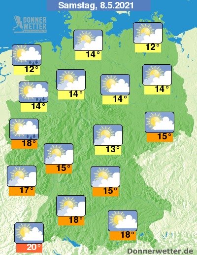 Am Samstag ist es im Süden oft heiter bis sonnig. Im übrigen Land ziehen teils dichte Wolken durch, teilweise zeigen sich Auflockerungen. Im Norden und Westen fällt dazu auch etwas Regen, während es sonst weitgehend trocken bleibt. Die Temperatur steigt auf 12 Grad an der See und bis 20 Grad im Breisgau.