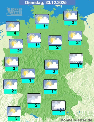 Am Dienstag zeigt sich das Wetter häufig heiter oder sonnig. Besonders südlich des Mains und über Sachsen ist es dagegen oft stark bewölkt oder trüb, hier sind einzelne Schneeschauer, teils auch Schneeregenschauer möglich, sonst bleibt es zumeist trocken. Die Temperatur steigt auf 0 Grad in Jena und bis 4 Grad in Cuxhaven.