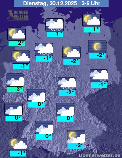 In der Nacht zum Dienstag zieht einerseits im Norden, andererseits vom Osten bis in den Südosten Deutschlands ein Niederschlagsgebiet mit Schnee, Schneeregen oder Regen, dazu kann es erheblich glatt werden! Im übrigen Land ist es überwiegend stark, teils auch aufgelockert bewölkt und weitgehend trocken. Die Temperatur sinkt auf 3 Grad in Köln und bis -3 Grad im Raum München.