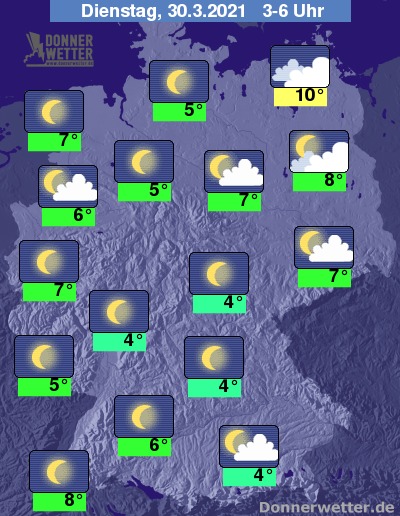 In der kommenden Nacht ist der Himmel verbreitet sternenklar, nach Osten hin ziehen aber auch hier und da lockere Wolken durch. In Vorpommern ist zudem auch noch dichte Bewölkung möglich, dazu bleibt es aber trocken. Die Temperatur sinkt auf 9 Grad auf Rügen und bis 4 Grad am Westerwald.