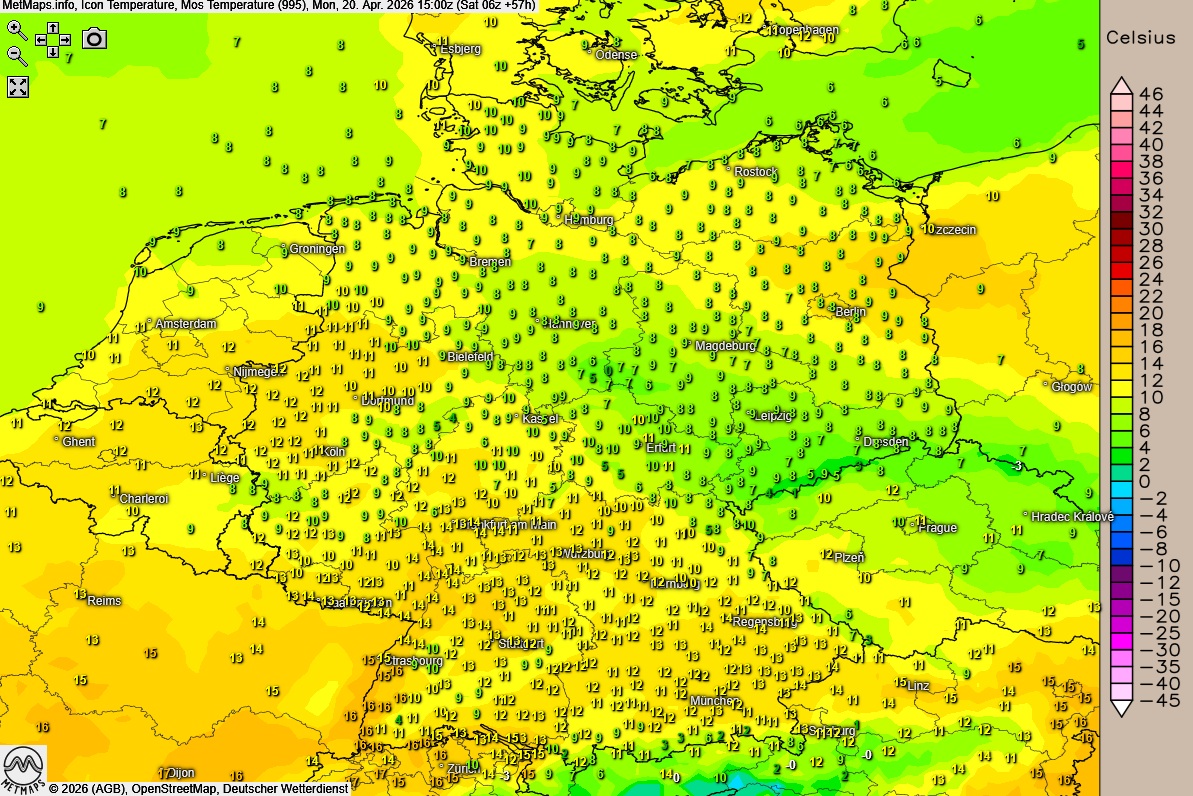 Die Wetterkarte für 06:00 Uhr, die Lufttemperaturen für 15:00 Uhr sowie die 24-Stunden-Regenmengen für Montag nach ICON: