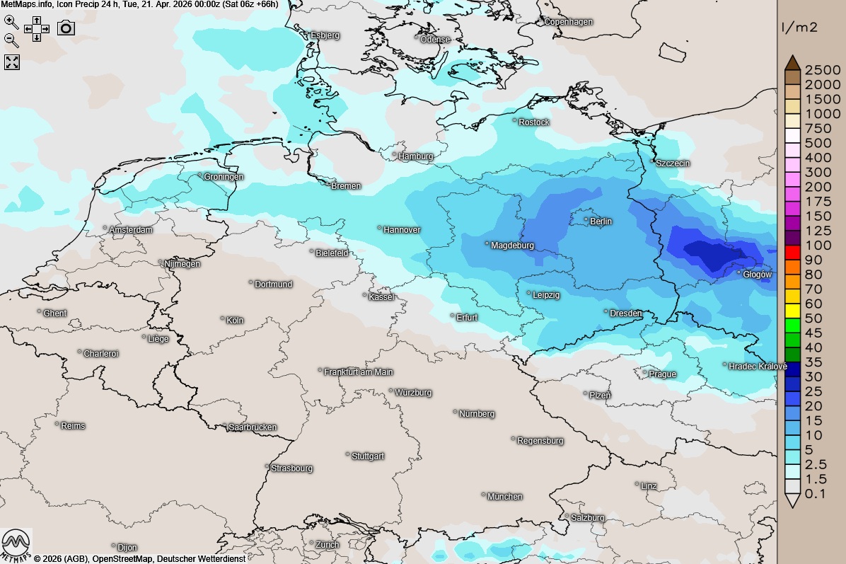 Am Montag zeigt sich der Himmel über dem Süden und Südwesten sowie später auch in Küstennähe heiter bis wolkig und es bleibt meist niederschlagsfrei. In den übrigen Landesteilen ist es zumeist bewölkt, dabei fällt von Norden über die Mitte bis in den Osten gebietsweise Regen. Auch im äußersten Süden sind einzelne Schauer und lokale Gewitter möglich.