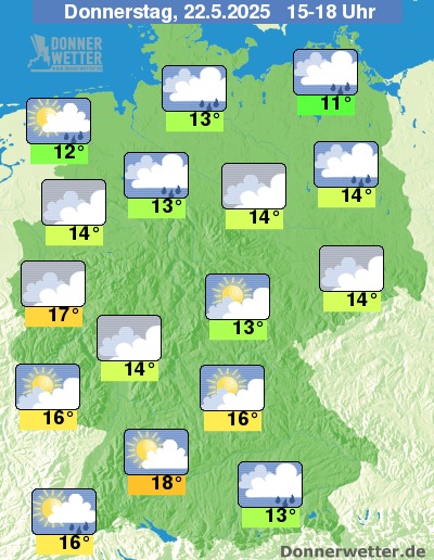 Am Donnerstagnachmittag zeigt sich der Himmel über weiten Landesteilen wechselnd oder stark bewölkt. Dabei fällt in der Südhälfte teils schauerartig verstärkter Regen, einzelne Gewitter können nicht ausgeschlossen werden. Auch in den nördlichen Landesteilen muss am Nachmittag mit lokalen Regen- oder Graupelschauern gerechnet werden. Dazwischen ist es in den nächsten Stunden wolkig und es bleibt meist trocken.