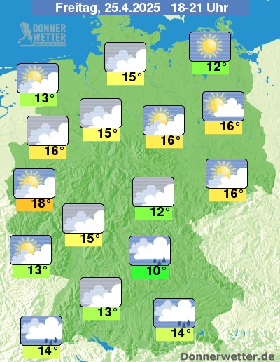 Heute Abend fällt im Süden unter dichten Wolken noch gebietsweise Regen, vor allem über Bayern. Vor allem im Nordosten, aber auch im Osten ist es oft heiter oder sonnig. Im übrigen Land ist es noch teilweise stark bewölkt, häufig jedoch auch aufgelockert bewölkt und dazu ebenfalls trocken. Die Temperatur liegt bei 10 Grad in Mittelfranken und 18 Grad in der Kölner Bucht.