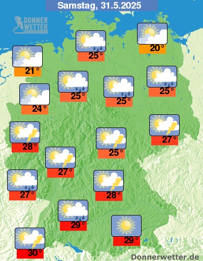 Am Samstag bleibt im Süden zunächst noch meist sonnig oder locker bewölkt und dazu trocken. Im übrigen Land ziehen bereits zum Teil dichte Wolken durch, dabei sind lokal Schauer möglich. Am Nachmittag ziehen von Westen her Schauer und mögliche Gewitter auf. Die Höchstwerte erreichen 20 Grad auf Rügen und bis 30 Grad am Oberrhein.