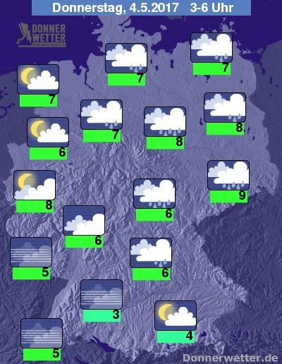 In der Nacht zum Donnerstag klart der Himmel im Südwesten des Landes verbreitet auf, auch im Süden sowie entlang des Mittel- und Niederrheins bleibt es bei meist lockerer bis aufgelockerter Bewölkung weitgehend trocken. Im großes Rest der Republik bleibt es hingegen wolkenverhangen und es fällt zudem immer wieder Regen. Die Temperatur sinkt auf 9 bis 3 Grad.