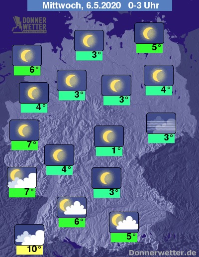 Die Temperaturen sinken bis zu den frühen Morgenstunden auf Werte um 9 Grad am Oberrhein und um -1 Grad in Franken.