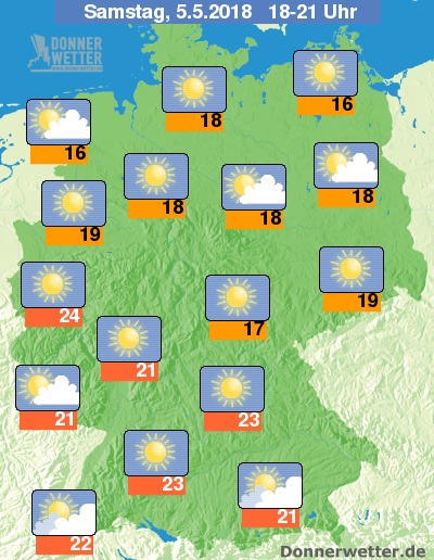 Heute Abend sind nur am Alpenrand auch mal dichte Wolken möglich, die jedoch nur selten etwas Regen bringen können, sonst ist es verbreitet sonnig und nur hier und da sind auch ein paar Wolken möglich, dabei bleibt es trocken. Die Temperatur liegt bei 16 Grad an der See und 24 Grad in Köln.