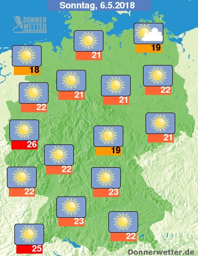 Am Sonntag ist es weitgehend sonnig, nur hier und da können sich ein paar Wolken am Himmel zeigen. Es bleibt überall trocken bei 18 Grad in Bremerhaven und 26 Grad in Bonn.