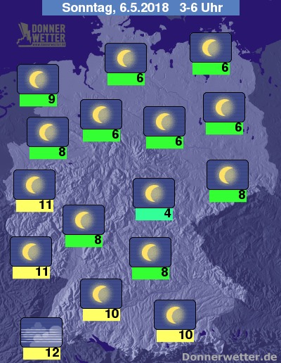 In der Nacht zum Sonntag funkeln über dem gesamten Bundesgebiet die Sterne von einem wolkenlosen Nachthimmel, dazu bleibt es natürlich trocken. Die Temperatur sinkt auf 12 Grad in Freiburg und etwa 4 Grad im Thüringer Becken.