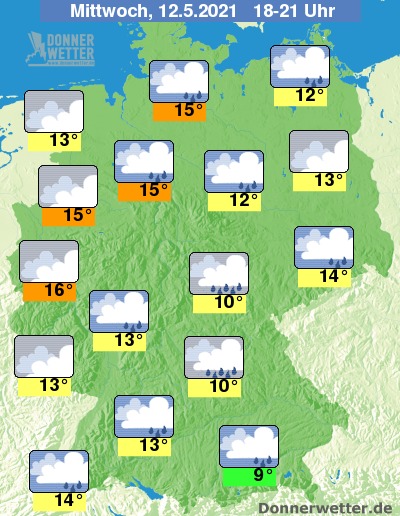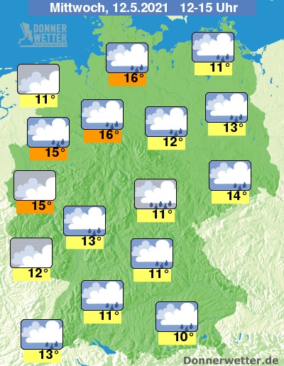 Heute Nachmittag halten sich im Land dichte Wolken, dabei fällt über der Südhälfte zeitweise, im übrigen Land fällt gelegentlich Regen. Die Temperatur steigt auf kühle 10 Grad in Berchtesgaden und bis 16 Grad im Norddeutschen Tiefland.