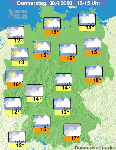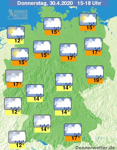 Am frühen Nachmittag regnet es vor allem im Nordosten und Osten, sonst stellt sich eine Mischung aus kurzen Auflockerungen mit etwas Sonnenschein und dickeren Schauerwolken ein, vereinzelt kann es dabei auch mal blitzen und donnern.