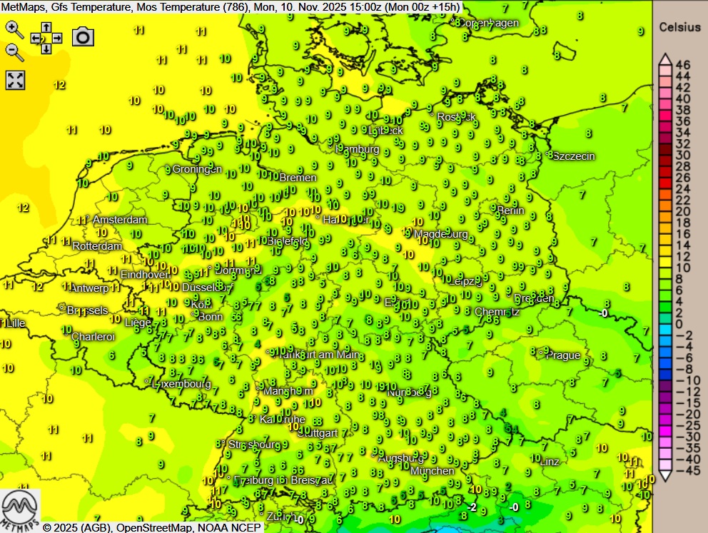Am Montagnachmittag nimmt die Bewölkung von Westen her zu, zum Abend hin setzt dann leichter Regen ein. In den übrigen Landesteilen bleibt es über die Nachmittagsstunden teils nebelig-trüb, teils ist es aufgelockert bewölkt und es bleibt weitgehend trocken.