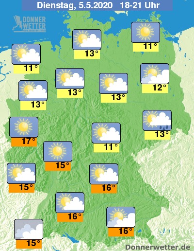 Am Abend können im Stau des Erzgebirges noch letzte Schauer auftreten, auch direkt an den Alpen halten sich noch dichte Wolken mit etwas Regen. Im übrigen Land wechselt sich die allmählich untergehende Sonne mit durchziehenden Wolkenfeldern ab und es bleibt trocken.