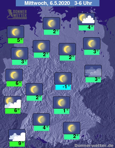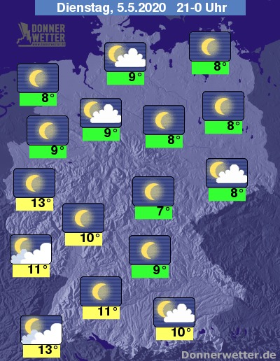 Bis Mitternacht lockern sich die Wolken auch im Süden allmählich auf, sonst kommen verbreitet Mond und Sterne zum Vorschein.