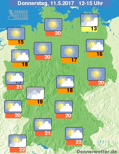 Die Höchstwerte liegen heute bei kühlen 14 Grad an der Ostseeküste und schwül-warmen 22 Grad an Rhein und Donau.