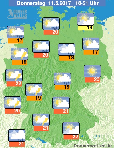 Bis zum Abend erfassen diese Luftmassen dann auch die restlichen Landesteile. Zwischen Nordsee und Schwarzwald kommt es neben längeren sonnigen Abschnitten zu teils kräftigen Schauern und Gewittern. Trocken bleibt es zunächst noch entlang der Grenzen zu Polen und Tschechien.