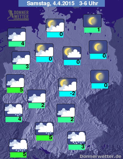 In der Nacht zum Samstag hält sich in der Südwesthälfte von Deutschland weitgehend dichte Bewölkung, dazu fällt immer wieder Regen, vor allem im Süden auch häufig Schneeregen oder teils Schnee. Im Osten und Nordosten zeigt sich der Himmel größtenteils sternenklar, in den übrigen Regionen ist es wechselnd bis stark bewölkt, aber trocken. Die Tiefstwerte liegen bei 5 Grad im Breisgau und -2 Grad im Coburger Land.