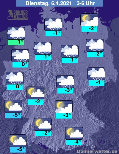 In der kommenden Nacht ist es im Süden meist locker bis aufgelockert bewölkt und trocken, an den Alpen fällt jedoch zunächst weiterhin Schnee. Im übrigen Bundesgebiet ist es oft stark, teils aufgelockert bewölkt und es fällt gebietsweise Schnee, Schneeregen oder Regen. An den Küsten weht ein verbreitet starker bis stürmischer Wind. Die Temperatur sinkt auf 1 Grad in Cuxhaven und bis -5 Grad im Oberrheingraben.